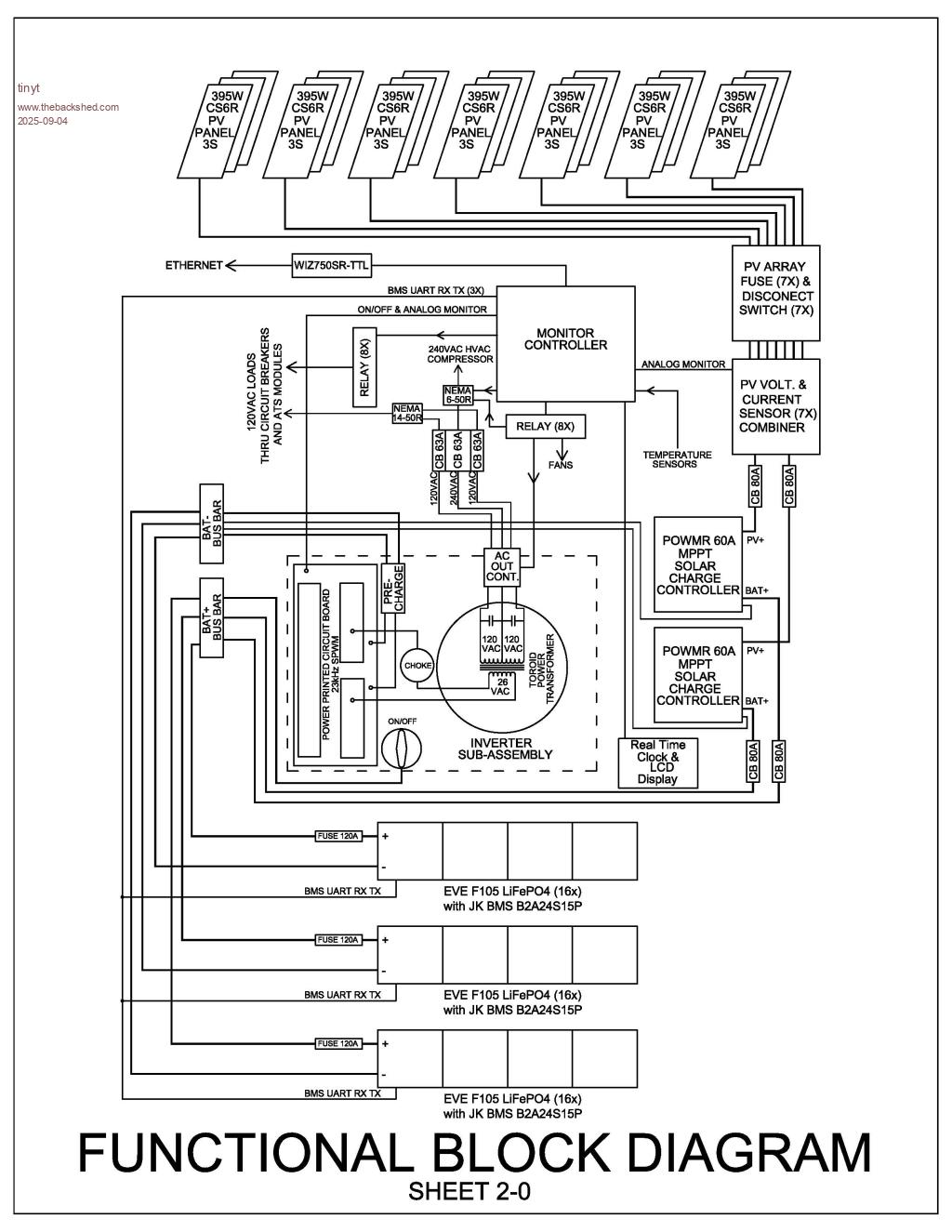 Nice diagram Tiny. I have done similar for my place for the next people who live here after I leave the planet. But my system is very simple, there are a few change over switches so the Grid inverters can feed back through two different battery inverters and there is a system of switching for using the EV charger Plus a voltage controlled relay that switches the GTI inverters off when the batteries are charged. No ethernet Batteries are Valve Regulated Lead Acid, so no complicated BMS. Just 4 regulators for the panels, and two GTI inverters for another two banks of panels. So instructions required for anyone else to know how a system that has grown from 1.2 kw of panels and one inverter, to 10kw plus of panels and 3 inverters. Good luck Pete |