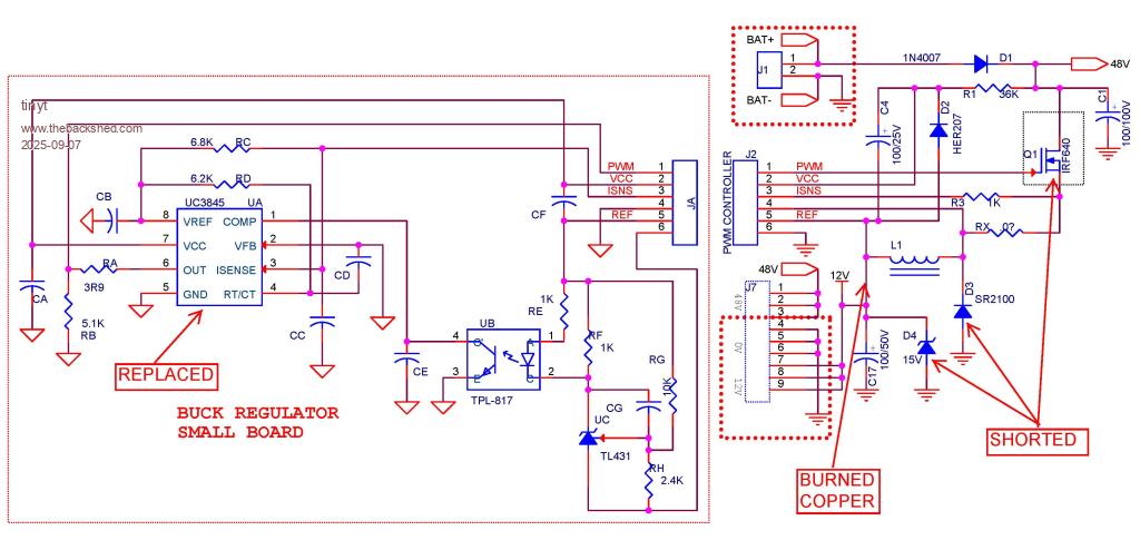 After removing all 24 mosfets and four pairs of totem-pole drivers, I tested to see if the 48V to 12V buck converter circuit is working. Of course it is not. Found shorted components and it took me a while to 'discover' a burned copper trace hidden under a connector. In the process, learned a little bit about how the UC3845 works. Replaced the shorted and suspect components, jumpered the burned copper and I now have 12 volts. |