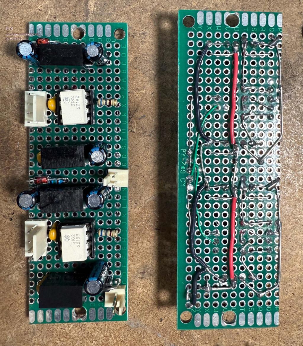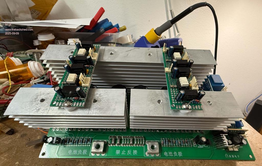 So, I assembled the two identical circuits on two prototyping boards. ![]() I tested the ouput voltages and they were as expected. With no input, the output of the FOD3182 is at negative bias voltage. I drilled and tapped the top of the heat sinks to mount the boards. ![]() I then looked at my reverse circuit drawing of the inverter. To fit the new driver circuits, I have to make 12 copper trace cuts, solder 2 jumpers, and solder a total of 22 wires for the connector harnesses. And I chickened out. A lot of things can go wrong: MY reverse is not accurate, mistakes in copper trace cuttings, etc. Also, I have no spare inverter. I have decided to save my work in case I really need to do it in the future. I think for now I will just concentrate on the compressor motor soft-start. And make sure I don't overload the inverter really bad. Edited 2025-09-09 13:20 by tinyt |