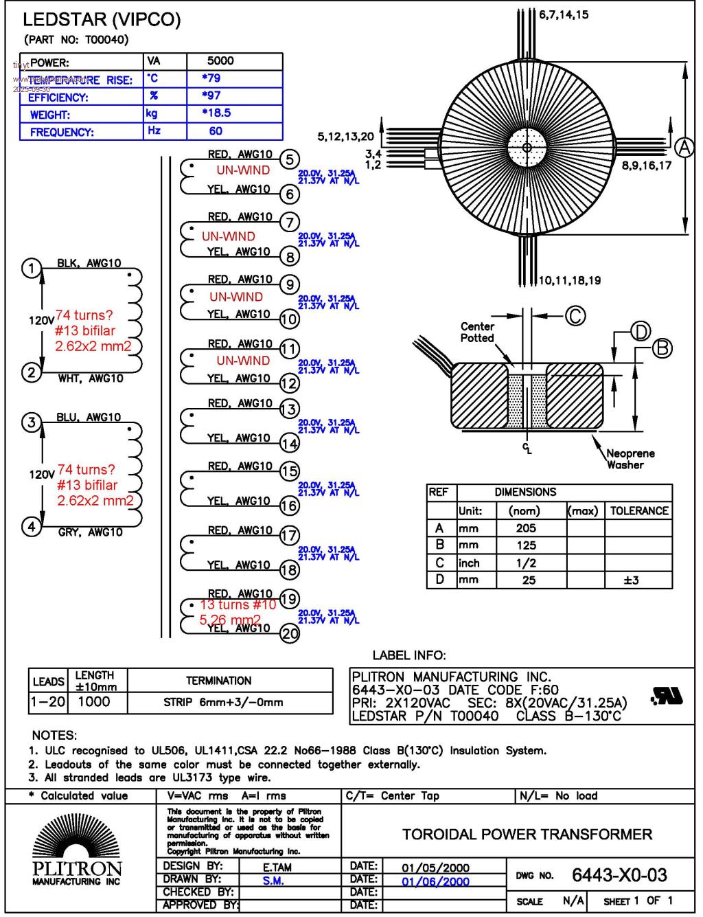 Secondary cross section for the 74 turns (120V) is (2.624 x 2) = 6.8757 mm2 for the 13 turns (20v) is (1.6277 x 2) = 5.176 mm2 Primary cross section for the 19 turns (26v) is 1.6277 x 20 = 32.55 mm2 Hmm ... the build thread and the diagram above indicate 14 AWG for each strand for the primary winding which has a 2.08 mm2 cross section. The 1.6277 number looks more like the diameter of 14 AWG. For the secondary winding (the 120V portion), the build thread and diagram indicate 2x13AWG + 1x14AWG. The "2.624x2" above would mean only 2x13AWG? Can you verify? Yes, you are correct, at my age I keep making mistakes now. AWG 14 cross-section is 2.08 mm2. And you are also correct for the secondary: The 120v section is 2x2.624 + 2.08 = 7.328 mm2 And the 20v section is 2x5.267 = 10.534 mm2 The primary is 20x2.08 = 41.6 mm2 |