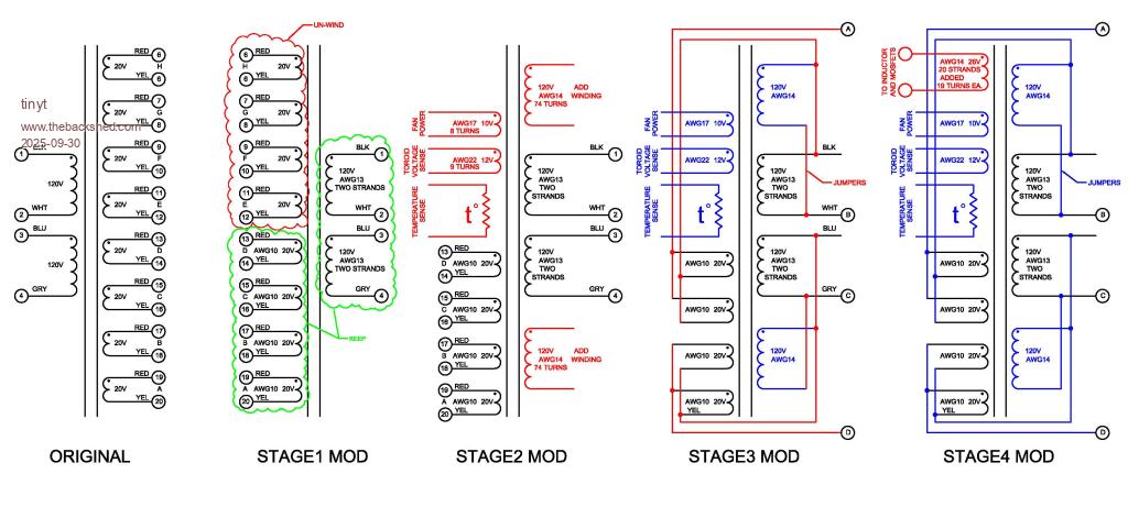 Complete build including testing results are in this forum. https://diysolarforum.com/threads/another-inverter-build.53006/ Interesting build thread. From a quick scan, it seems the transformer has the following windings: * Primary: 26VAC with 41.6mm2 (~1 AWG) winding. * Secondary: 280VAC (2 x 140VAC) with 7.3mm2 (~8.5 AWG) winding. Do I have correct understanding? If so, the windings seem a bit more beefy than I expected in a 5kVA transformer. Perhaps more important is the 10+ winding ratio which certainly seems higher than most other builds. I suspect these differences helped quite a bit to keep the output voltage high enough to start large inductive loads. It's also remarkable that the transformer only weights 42 lbs. For reference here is the data sheet of the original toroid transformer with my notes in red. ![]() Calculated weight says 18.5 kg (40.78 lbs). Seem that my mod added only 1.3 lbs. Here also shows my modification in stages. ![]() Using my notes and the picture above, and using number of turns instead of voltage, turns ratio is ((74 + 13) x 2) / 19 = 9.15 Secondary cross section for the 74 turns (120V) is (2.624 x 2) = 6.8757 mm2 for the 13 turns (20v) is (1.6277 x 2) = 5.176 mm2 Primary cross section for the 19 turns (26v) is 1.6277 x 20 = 32.55 mm2 I hope I got my rithmetic right. Edited 2025-09-30 07:12 by tinyt |