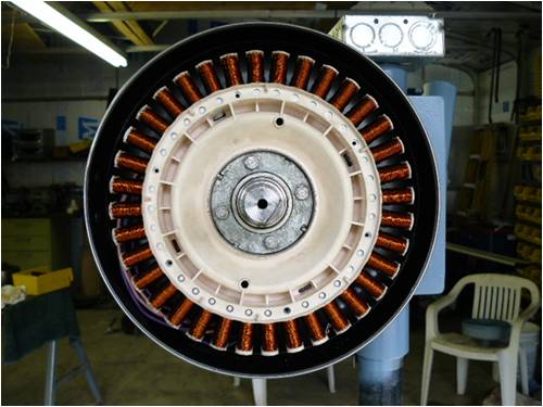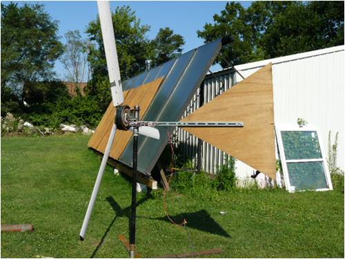 Completed more work on my mill here are the progress photos. My women and I where driving in the car yesterday when all of a sudden she hit the brakes(she was driving) and hung a quick u turn so I asked her what was that all about and she said I JUST FOUND OUR NEW TAIL FIN. I will also install a nose cone when possible. Of course now that I am ready to start producing some juice (wind trials) there's no wind to be found. I had a difficult time figuring out a way of keeping the weather out of the stator but finally went to Wallmart and bought a saut'e pan to use as a backing plate/weather protection it will also provide cooing.