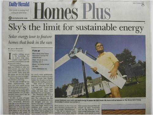Ok guys here's one for you. Here in the states we have what they call The National Tour of Solar Homes it's on October the 3rd Saturday. People who wish to see sustainable energy systems are welcome to visit homes that are open to the public and of course yours truly will have his home open and ready for the tour. Last year during the course of a day we had about seventy people visit my place. I belong to the Illinois Solar Energy Association which promotes the tour in my area. It just so happens I had a news reporter stop by to interview me and check out my system, recognized that sexy looking mill in the photo. Yes I did tell they about the Back Shed web site and I will be telling all the folks that stop by about it as well. I guess its the big time for us mill guys!!