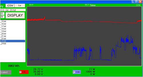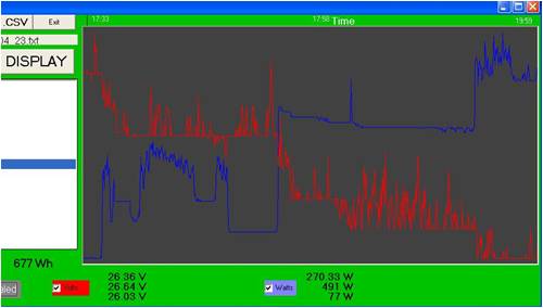 Hi Bruce, Are you able to show some graphs of the data obtained from the logging you mention on this meter for, say last Friday. You may want to show say the maximum power on each of the sensors, and at what time it occurred for example. If you can, it would be interesting to show say for a 1 hour period, a graph of an interesting period of import, or export power. Here are some graphs I recorded with this new logger app. The first is the inverter load to the house, and Terminal voltage of the Lithium Battery for the whole of Friday. The next is a graph of a portion of this day from 5:30pm till 8:00pm. During this time, the battery was discharged approx 40%, and there was 0.67kW used. The max consumption was 490W, and the minimum was 77W. The battery terminal voltage fell from 26.6V down to 26.0V during this time. This sort of data on a full sized home RE setup is invaluable. The key to logging is a rapid viewing of the logged data. I think that a point and click viewing of the data is applicable. The totalling system works for someone who is using it for billing purposes, but really something beyond a trending record is required. I have more thoughts on a daily total separate log, so yearly comparisons could also be done. I have a rudimentary implimentation , but this I hope to improve. Gordon. become more energy aware |