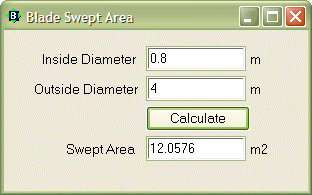 This is an example of a little program to calculate swept area. Very basic stuff at this stage. nomainwin WindowWidth = 312 WindowHeight = 195 UpperLeftX=int((DisplayWidth-WindowWidth)/2) UpperLeftY=int((DisplayHeight-WindowHeight)/2) statictext #main.statictext1, "Inside Diameter", 38, 21, 96, 20 statictext #main.statictext2, "Outside Diameter", 30, 51, 104, 20 button #main.button6, "Calculate", [CalculateArea], UL, 142, 76, 104, 25 statictext #main.statictext7, "Swept Area", 62, 111, 72, 20 statictext #main.statictext9, "m", 246, 21, 144, 20 statictext #main.statictext10, "m", 246, 51, 144, 20 statictext #main.statictext11, "m2", 246, 111, 144, 20 textbox #main.SweptArea, 142, 106, 100, 25 textbox #main.OutsideDiameter, 142, 46, 100, 25 textbox #main.InsideDiameter, 142, 16, 100, 25 open "Blade Swept Area" for window as #main print #main, "trapclose [quit.main]" print #main, "font ms_sans_serif 10" [main.inputLoop] wait [quit.main] Close #main END [CalculateArea] print #main.OutsideDiameter, "!contents? OutsideDiameter"; print #main.InsideDiameter, "!contents? InsideDiameter"; OutsideDiameterArea=(OutsideDiameter/2)^2 * 3.14 InsideDiameterArea=(InsideDiameter/2)^2 * 3.14 SweptArea=OutsideDiameterArea-InsideDiameterArea print #main.SweptArea, SweptArea wait produces this little app