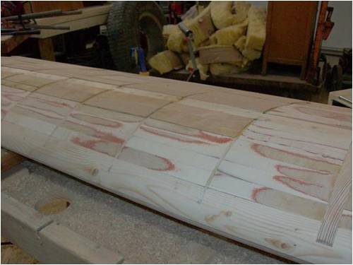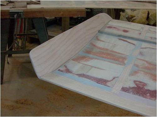 I was talking about the skin of the wing earlyer, here is picture of a section where you can see the skin being sanded down to profile, and a few small sections of this that have just been glued on. Notice the thickness differance, and how much will be taken away with the sanding process. The color variation in the shin is from different ply's of the skin as they are exposed from sanding. I keep an eye on this because it helps me guage how deep I'm going with the sander. The final debth/ height, is even and/or flush with the profile of the ribs. The ribs were all clamped together as a group, evened out as best I could and then gang sanded to ensure they all had the same profile. (this was ofcourse prior to assembly). .....Mac46 I'm just a farmer |