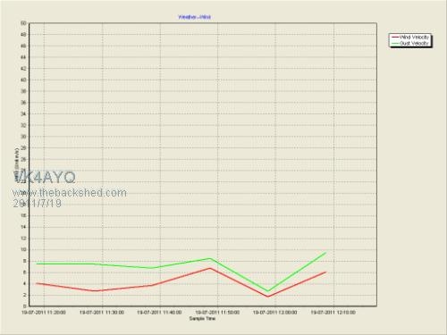 This is a snapshot of the wind for the time I took the readings. As you can see there was a fair bit of gust component so it isn't a steady wind reading. After I hooked up the mill again it was doing average 15 amps 30 volts in these conditions. Hope it has been of some use, I feel that Phills Logger would be a more accurate reading than standing there watching meters and writing it down. Fun Isn't it. All the best Bob Foolin Around |