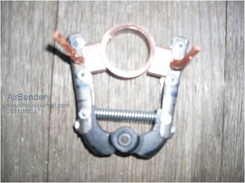 I plan to solder some lugs onto the brush pigtails, then I will drill some holes though the brush arms and put in some small bolts as terminals and then I will run a wire from one arm to its partner on the other side which will link the two brushes together. The wires from the motor are long enough to reach the brush arms so I will just connect them onto the brush arm terminal bolts as well. I have put some terminal bolts through the pvc pipe at the top of the rings which I have terminated the wires from the rings onto and which I will conect the wires coming up the pole onto.