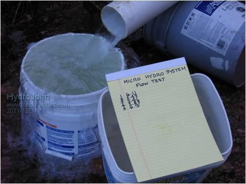 [quote=Dave]7m * 4L/s * 9.81m/s squared * 50% = 140 Watts.[/quote]I was concerned that the numbers that Dave used may be a bit over estimated, so I decided to determine the exact flow, head and penstock length. The true numbers are: