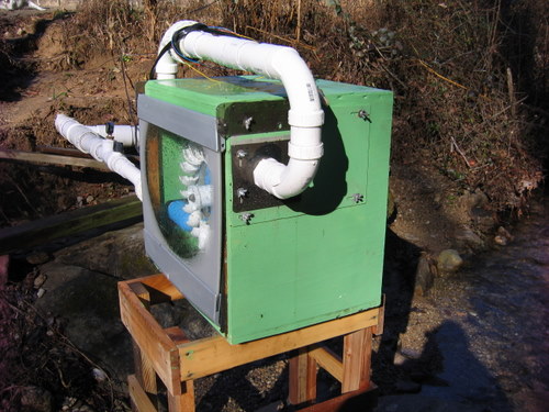 I'm not sure that my small stream (Amos Creek) could handle something mechanical like that. I could be wrong! Have been many times. My penstock (500' remeasured) is straight (no elbows or abrupt turns) with no high or low spots to create air locks. Don't think I have much room for improvement here without increasing the size of the pipe, but couldn't justify the cost.