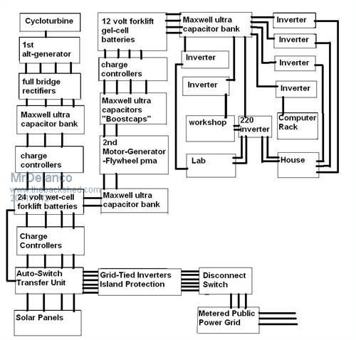 Hello Phill M; Here is the updated block diagram showing the solar side with auto circuit between the solar and the system that separates the solar. When the batteries are charged the solar dumps all it's output into the power grid through six(6) grid-tied inverters. I don't rely on the solar that much it's not reliable during cloudy or rainy days or snow cover, plus the trees have grown and shadow the arch of the sun at certain times during the day. I stated in the beginning I used solar and found it was not reliable. Regards Bob MrDelanco:Project Videos It is not only too know what it does but to understand how it does what it does. |