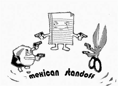 Hey Don That's quick shooting pardner ...and no guns! I wasn't after the code with the Mexican Standoff quip. I really wanted to draw a cartoon to depict the situation but I had to put together a 1000 words instead! I'm no cartoonist