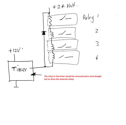 Ok, if you check the prior posts, we are running off a 12v power supply. Stepping up to 24V with a step up circuit. So the output from the timer will still be 24V. So basically how many pumps can I run off this timer. 1 X 24v pump. 2 X 12v pumps. 4 X 6v pumps? How many volts can I pump through this circuit to run however many pumps? Do not worry about time they probably only run for 5 min maybe twice to 3 times a day. Seperate lines - meaning pipelines E.G 2 pumps would run, 2 X 6Mtr pvc pipe (one pump per pipe) If I can get 4 pumps running of one timer E.G 4 X 6v off 24V supply pumps then I would run 4 lines. If only 2 pumps@12v each = 24v usage on 2 lines. Basically it's an attempt at keeping costs down by not having one timer per pipe. I don't really want to constantly mod timers for the rest of my life haha! The other way is to just tag another 6mtr length on the end of the first and expand that way, but then I would need faster flowing pumps which may increase the price due to the Ltr per Min rating. Still working this bit out to see whats cheaper/easier & best in the long run for expansion. The 48v thing is a question. The timer can obviously take 240v AC, but I know DC is a bit different. Curious to know what the maximum DC voltage the timer could take? I will then attempt to revolve the amount of pumps around this (Hopefully!) Hope that helps explain better. I type fast sometimes and often end up not filling out my sentances properly so sorry if if this causes a bit of confusion. I am slack on the keyboard! This is my signature ---> Scribble, scrawl, a bit of light pencil shading, some indelable ink and a bit of caligraphy. |