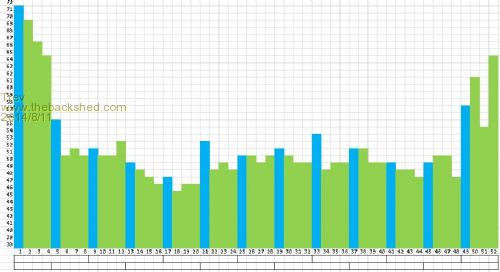 Here is a graph of the end of charge (peak pack voltage). The voltage of each cell is up the left hand side. Lowest cell reading 3.45v and the highest cell reading 3.71v. The bars at the bottom indicate where the Relativities were, which cells they covered.