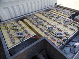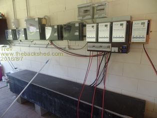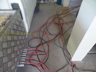 The 4 regulators are programmed to be exact 3.5v per cell over the entire pack. Changeover switches make it easy to switch between the house battery bank (48v) and the EV Hilux battery banks.