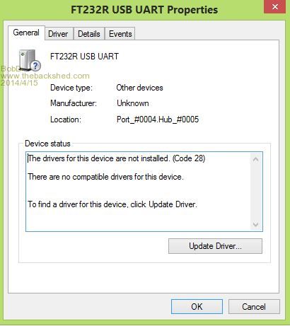 see my earlier post in this thread, or check out: http://www.dontronics-shop.com/usb-communication-problem-ftd i-ft232r-1213-c-bug-and-workaround.html Cheers Don... Don, this works. Thanks. Big question two Win 8.1 systems OK with V2.10 of the FTDI driver and one is not? Great. I found similar things. If all else fails, try: http://www.dontronics-shop.com/usb-communication-problem-ftd i-ft232r-1213-c-bug-and-workaround.html The big trap is you have to remove the two entries from two different menus to remove the driver in the first instance, else you may have two different versions installed incorrectly. I am still waiting on answers from the engineers at FTDI. They seem to have gone to ground when I hit them with my findings. Cheers Don... https://www.dontronics.com |