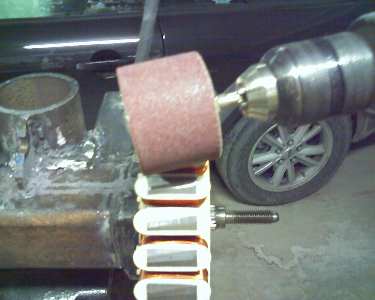 It took some experimenting, I started with a narrow sander (like the one in the pictures) I bought just for the job, but I settled with the old drum sander with a 2 inch or 5 cm diameter drum. The metal must be very soft because it was an used 80 grit paper roll that I used worked well for the entire stator. Like I said I did not think of turning it on an angle until I was half done so I have half straight and half on an angle. It is difficult to hold the sander on the angle to get it started though, the sander wants to jump over the pole in the direction of rotation, so you have to hold it tight and watch where its grinding. I just finished wiring the stator with your single 5 pole and triple 3 pole conefiguration you came up with. I separated the 5 pole in between the 3-3 pole sections of the stator to give the stator a more balanced load. Of course its not perfectly balanced, two 2 pole 3 phase sections for the 5 pole Y are separated in between 3 pole 3 phase sections leaving one 3 phase section roughly 120 degrees around the stator from the other sections of the 5 pole Y connection. It required more soldering, and I don't know if it would make any difference. KiwiJohn noticed my poor welding skills, I'm sure I'll get better. I just took up welding for this project, I no longer have my professional welder freind to rely on. Anyway its worth a laugh. John |