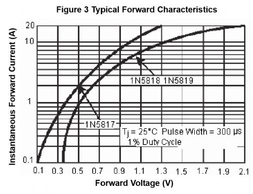 Hi Grogster, I wouldn't put a lot of faith in only a 0.1v drop across the 1N5819.. In my playing with them I find it closer to 0.3V TO 0.4v.. The specs are a bit vague on static current draw but the table of a 1% duty cycle shows exactly my results for the IN5818/19 but the 1N5817 (which I have never used) is at 0.1V at 100ma but these ramp up as current increases.. at 40V 1A draw the 1N5819 drops 0.87V but of course you aren't using them at that current/voltage either.