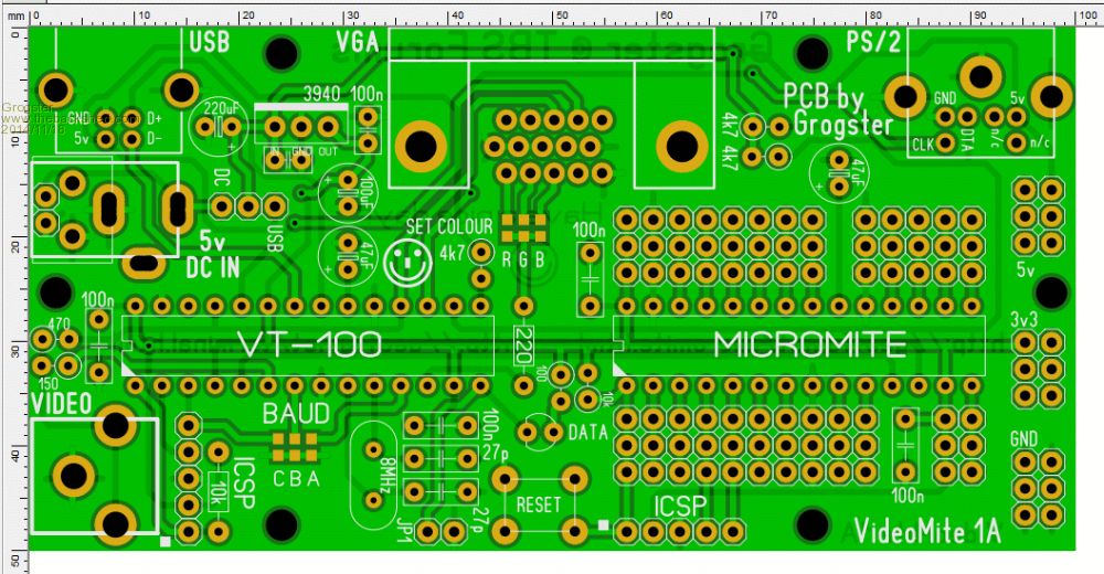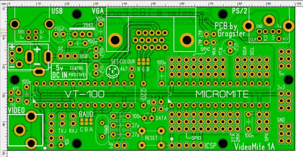 Thanks for that turn-around info. Here is the image with the changes you suggested: EDIT: I have added two jumpers - TXJ and RXJ. With these jumpers in place, the uM is routed to the VT100. If you remove them, you can then use lower pins of those jumpers, and the GND from the adjacent ICSP, as a serial connection to the VT100 if you want to use it separate from the on-board Micromite in testing other hook-ups. Likewise, you can remove these same jumpers, and then tap into the Micromite console, without the VT100 upsetting the mix by being permanently connected. The normal arrangement, would be jumpers on these two points(and transfer code to the Micromite via the VT100's USB interface), but it gives you the flexibility to alter things depending on what you happen to be doing.