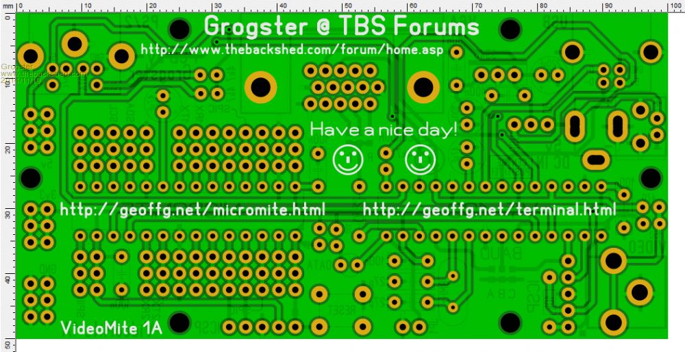 Hey Grogs is that left hand smiley face on the `back side' ME? Minor Criticisms. If you can make the + and - a bit bigger font for power input it would be better. If you can move the USB from the jumper up and maybe r/a (with a line pointing to the pin if needed) then the CENTRE POSITIVE message can be level with 5vDC IN and the entire message enclosed in the BOX. Regards, Mick PS. Were you able to shave 0.5mm off the height to panelise for cost saving? Although on second thought that might not be necessary anyway 2 x 50mm boards with the vee groove down the centre would probably be ok anyway.. If you want me to create a border outline with cut outs gerber for you let me know. PPS. My second lot of boards arrived from Shenzhen today, the first lot took 14 days for postage, this lot took 16 days.. Not bad for the price compared to the expense they want for DHL. Regards, Mick Mick's uMite Stuff can be found >>> HERE (Kindly hosted by Dontronics) <<< |