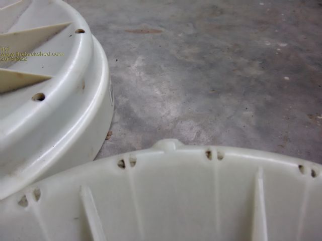 photo showing the diffrence between a arrow head f n p rotor cap and a standered f n p rotor cap, the arrow head rotor has 5 small knobs around the outside edge of the rotor cap, knob can be seen in photo, the standered older type rotor cap in backgound. Arrow head rotors have very little cogging because of the arrow head shaped magnets,as explained on other pages in the back shed forum,and the 36 pole comes from the factory with rounded pole ends( all ready decogged), good for windturbines. The black f n p rotor cap is usually on a aluminum stator,so if you come across a f n p washing machine at the dump and it has a arrow head rotor cap, it will most likely be a copper wound 36 pole stator,thats good,and one with the black rotor cap will most likely be a 36 pole aluminum wound stator,so grab the black rotor cap(can be hard to remove because of stronger magnets) but leave the stator that it is on,most likely aluminum windyings,good for nothing. The aluminum stator usually has the letters A L stamped on it. The black rotor cap can give you about 20% more power out of a 36 pole copper stator when compared to the arrow head rotor cap. hope this info is of some use to sombody. Edited by flc1 2016-08-23