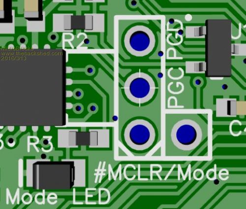 This will allow to put the pic16 into programmer mode easier. Just place a jumper on #MCLR and Mode. The Mode led will then indicate programmer mode. The second is a 3v3 header to make all the needed pins for the pic16f1455 icsp available. I tried to fit in a 5 pin icsp header but that is with only two layers very difficult. For normal use you would probably never need them, but for hackability a must.