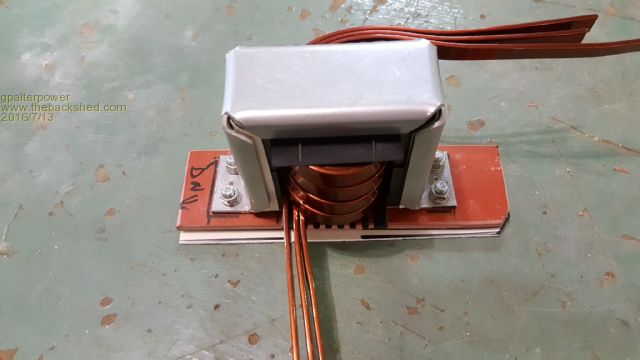 After bareing back the ends of the 3 layers of 8 x 3 enamelled copper, I formed a wedge and drove it into 2 battery lugs so it would accommodate the copper. It was a snug fit and with a little heat applied, the solder took nicely
