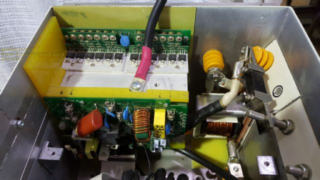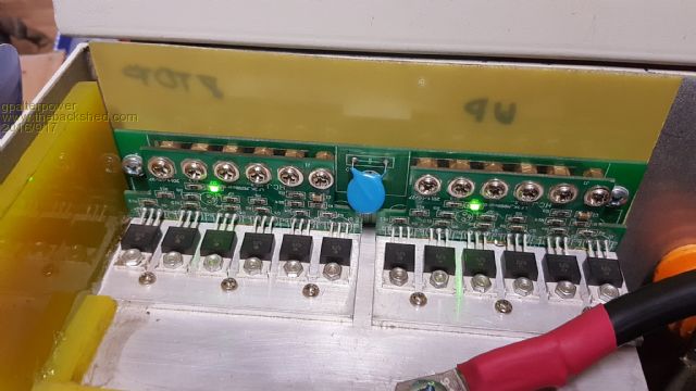 Well I finally finished the inverter and took it home. Hooked it up to a battery bank and hey presto.......the fan worked. Yay! This was something that I was really concerned about, but it drew a LOT of air in and thru the main board, so in that department I was happy. I then plugged in a small load, a fluro work lamp. Turned on the inverter switch and stepped back a little. The lamp came on and then the inverter was groaning somewhat so I shut it down. Another try this time watching the ammeter. After a few seconds start up, the ammeter steadily climbed to about 90A DC. Turned it off again and opened the front door and had a look to see if there was anything out of the ordinary.. All looks ok. Power back on but inverter off there are 2 green leds that are glowing on the pos heat sink side.