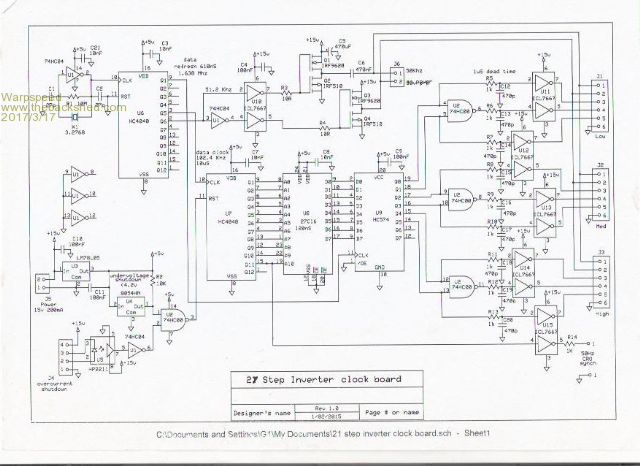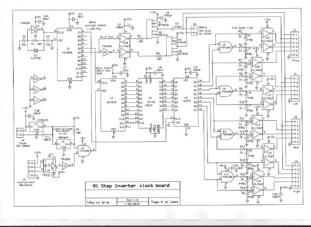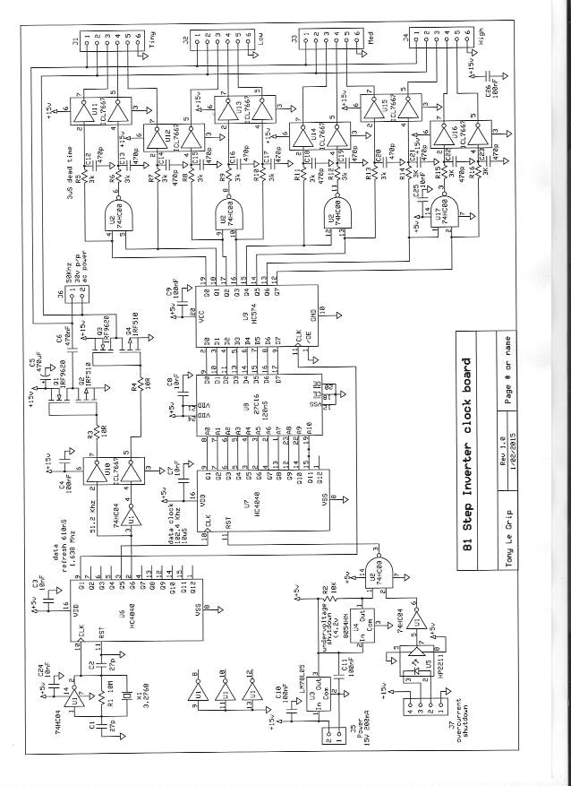 Ok, here is the schematic of the three inverter, 27 step clock board that provides all the required drive signals.