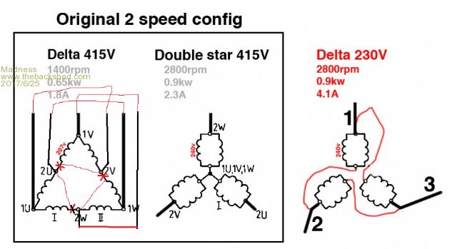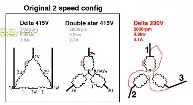 No Mad look at your pic here ![]() Look at your double star....... keep looking..... now make it delta???? done!!!... do not look at the delta 415v pic..... look at the center pic and the right pic... penny dropping now.... Look at the thing I said about connections.... 1W-2V then 1V-2U then 1U-2W.... same as delta 230v one. The coils stay the same as the diagram, but you simply go from star to delta. NO COILS ARE SHORTED It is the same power, near twice the current as star... you have said so in the third ( Right hand side) pic...... and it can be done without removing the motor at all. ie 1U,1V,1W and 2U,2V and 2W come out at the connection block do they not? ......oztules Village idiot...or... just another hack out of his depth |