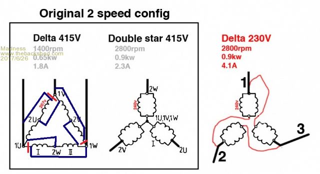 In case anybody in the future is looking at doing the same, I just realised the modification diagram is incorrect. The double star is effectively turned inside out when compared to the Delta 415V. So I have redone the modification diagram, coils with the red line through them need to be cut at the red line and reconnected as per the blue lines. ![]() There are only 10 types of people in the world: those who understand binary, and those who don't. |