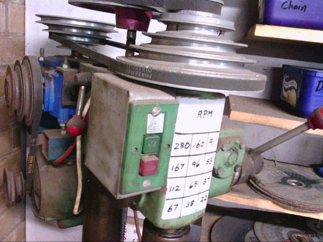 [quote]it would be really good for a drill press or small lathe.[/quote] The problem with using a VFD on a drill press or a lathe is that it will certainly slow the speed right down almost to zero, but you don't get any extra torque multiplication at the reduced speed. If you use gears or pulleys to drop the speed in the usual way, that also multiplies the torque which is often as important as the reduced speed. A VFD could still be very useful, especially with a foot pedal, but it will never replace really low gearing. For very large hole saws and monster drills I built this: ![]() The blue thing at the back is a 10:1 worm drive right angle gearbox. With the two sets of cone pulleys I can get down to 22 RPM. Cheers, Tony. |