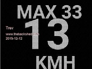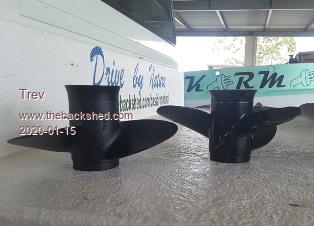 Got 2 new propellers. 9.25 x 10. Original propellers 9.25 x 7. ![]() Headed out to the water for another test At rest, battery voltage measured at 53.1v. This test was heading into the wind 15.6A 6km/hr 23.3A 6km/hr 40A 7km/hr 52A 9km/hr 69A 10km/hr 88A water sprayed up in the wind, over the bow so give more throttle quickly 170A 17km/hr 176A 19km/hr 180A 21km/hr 210A 25km/hr 225A 27km/hr 273A 29km/hr 277A 30km/hr Screen shot the speedo after we stopped. Max at 33, but mostly could only achieve 30km/hr I wanted to see what one motor could do on its own so lifted the other motor and disconnected the power cable. Flat out at 13km/hr. Bear in mind though this was with one motor on the side of the boat so not a direct push. steering turned to get boat to track straight. Trev @ drivebynature.com |