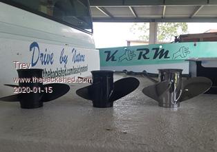 Another set of propellers. 9.5 x 13. Stainless steel. There is not a lot of visual difference between the 9.25 x 10 and the 9.5 x 13. ![]() ![]() Made some changes to the steering setup. We now have a temporary forward control. ![]() ![]() ![]() Numbers for the stainless steel props. Probably not what they should be. The cav plate was borderline with the smaller props. With the slightly bigger diameter stainless steel props, they cavitated a little. Achieved similar speed with less amps. 15A 6km/hr Planing at this speed 31A 7km/hr 45A 9km/hr 50A 10km/hr 70A 11km/hr 100A 16km/hr 120A 18km/hr 160A 20km/hr 170A 25km/hr 200A 28km/hr 250A 30km/hr 256A 31km/hr Max throttle could only get 256A The highest speed we saw was 31km/hr, but mostly could only get 30km/hr max. Here is a comparison of the 3 propellers Edited 2020-01-15 10:47 by Trev Trev @ drivebynature.com |