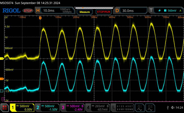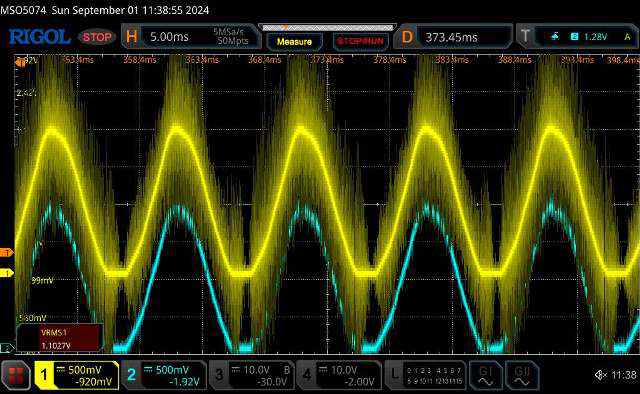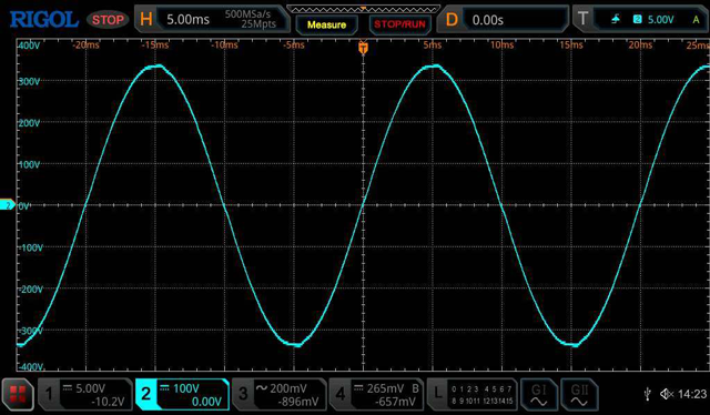 FYI: The Inverter running separately at Idle and Loaded : AC Total Harmonic distortion. No Load 0.9% THD 2.3kW Jug (resistive load) 0.6% THD. Almost all fundamental frequency, the first and second odd harmonics are tiny, the third barely visible, nothing after the 3rd odd harmonic, this tester reads out to the 37th harmonic. These are seriously impressive values for an Inverter. BELOW: AC waveform @ 2.3kW, it looks the same at Idle: When I switch a 2.3kW load onto the Inverter running at idle, the AC drops half a volt. I'm measuring AC at the end of an extension lead and plug board across the 2.3kW load. The only visible change captured on the DSO is that slight half a volt drop across the lead to the 2.3kw Load. ![]() _ Edited 2024-09-10 14:37 by KeepIS NANO:Inverter V 8.2ks - Linux AvrDude GUI script V4.1 |