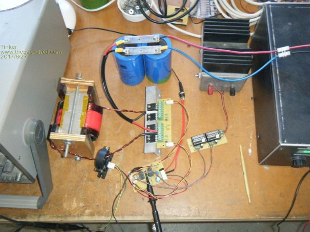 After Solar Mike has been doing some choke saturation testing I just had to try that myself The approach was a bit different, I split the circuit into a driver PCB and a power PCB. That used up some small PCB offcuts and also made the connecting a little easier, IMO anyway. Here is a picture of the test set up: ![]() And another, showing details better: ![]() Testing was done with my choke (2 x C ex Aerosharp)cores epoxied to a plywood backing and hardwood side bits. This made a very strong 2 piece core assembly, which let me easily insert the wound coil and also change the air gap spacers. The coil was wound from recycled 1.8mm dia wire (2.5mm sq) which I wound on 2 in hand, simultaneously. I did this on the lathe, manual powered chuck and the tool post clamping the wires to wind with an even strain. 125 turns were wound on, why 125?. I had two skeins of 500g wire and these gave 125 turns 2 in hand .Test 1 with a 2x 0.8mm gap (laminex pieces) got to saturation at 10A, giving 1250A/t Test 2 with a 2 x 1.2mm gap (plastic sheet) got to saturation at 12.5A, 1562.5A/t Test 3 with a 2x 1.7mm gap (original gap spacers) got to saturation at 20A, 2500A/t All tests were done at 52Hz. Here are a couple of CRO pics - sorry about the poor quality. Pic just before saturation: ![]() And this one with saturation: ![]() Its quite obvious when saturation occurs, the noise from the coil also changes. Note, the pics are not with the same air gap. These were just the clearest pics of the bunch I took Nothing got even remotely warm even when left running close to saturation for a while. The trace is also nice linear, which I like. So these cores seem to be suitable. They are made of a quite flakey material, not laminations, so I epoxy coated them to prevent material coming off each time they got assembled. From the above results the following coil will be wound shortly: One layer would accommodate 18 turns of 1.8mm dia wire, wound two in hand (5 mm sq). A total of ten layers would give me 18 turns of 50 mm sq. This would fit nicely and give me the maximum copper/ turn ratio for that core. I shall find out what inductance that makes when its finished. 18 turns would saturate at 138A, that's almost 7.5KW from my battery bank and a power level that I don't plan to get near once that inverter is finally running. My thanks go to Warpspeed and solar Mike for their valuable contributions with this choke core saturation testing. Klaus |