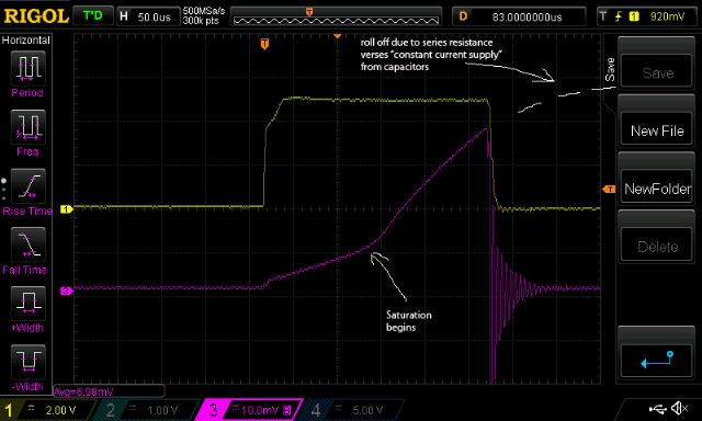 Here is what saturation looks like: ![]() One part of the (pink) curve rises at a low rate, then it changes to a faster rate of climb when saturation is becoming prevalent. Yellow is mosfet gate drive, pink is current, approx 1mV / Amp In my tests I frequently find inductors level out at some sort of current. In the case of the above, it's at about 45 Amps. This is due to series resistance of the circuit (inductor ESR plus mosfet Rds(on) plus wiring plus capacitor ESR) wronger than a phone book full of wrong phone numbers |