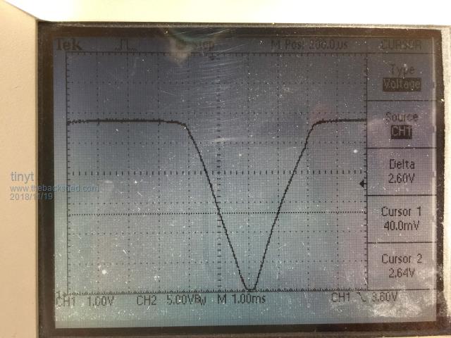 Next picture is with the cursors changed from voltage to time showing delta of about 1.8 (should be around 2.0) milliseconds at the falling and rising voltage thresholds.