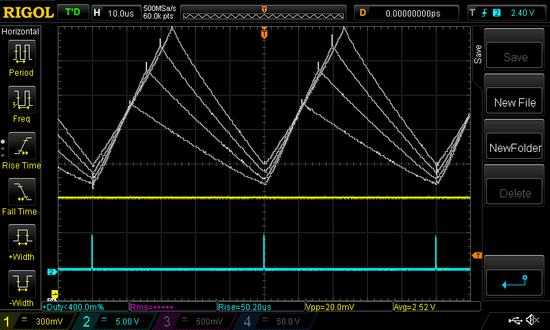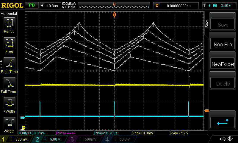 With only the 2.0mm core and not many turns, we see clearly the result of low inductance. i.e. very steep current traces.