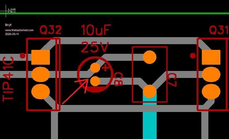 So I am thinking cut the track from the TIP 41C to the cap and make the connection under the board using the cap legs to make the new circuit path. Edited 2026-03-11 12:25 by Bryan1