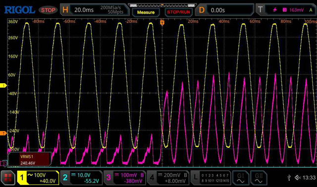 I'm just interested in the small ripples in the blue square. These appear just when the big load is switched on. I understood that the Arduino code calculates an error (following the trigger point? I don't have the code, just the picoverter code), then corrects the PWM of the sinusoid every 100Hz. So depending on the trigger point position, the PWM update may be delayed. If I rephrase my question in more adequate terms: did these ripples disappear when the Arduino adjusted its PWM or is it a coincidence? Sorry if I'm not clear enough or if I misunderstood / misinterpreted. I'm trying to understand the overall operation, but between my mind and the Austrian translation, bits are lost!! |