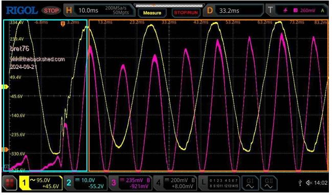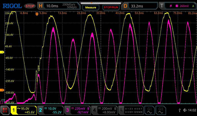 How I interpret that waveform display is as follows. The violet DC current waveform just after the idling first 2 left hand side small peaks is where the load was introduced. The DC input current reached a maximum at the point where the blue and orange touch. The voltage of the yellow waveform (AC volts out) has started to sag and continues to sag further for the rest of the next half cycle. The input current dip after the first maximum peak I assume is because the capacitor bank was initially supplying most of the current. However the next few input current peaks are increasing along with the output voltage so it appears that the feedback voltage is starting to correct now by increasing the PWM over these cycles. About 6 current cycle increases after the first minimum it appears the voltage and current have now settled and the sudden load has been corrected for. This indicates that from the point where the blue and orange coincide within about 3 complete cycles the load has been corrected for. EDIT: Whoops I started the reply before tea and finished it afterwards in the meantime KeepIS has responded to your question similarly. Edited 2024-09-21 19:39 by wiseguy If at first you dont succeed, I suggest you avoid sky diving.... Cheers Mike |