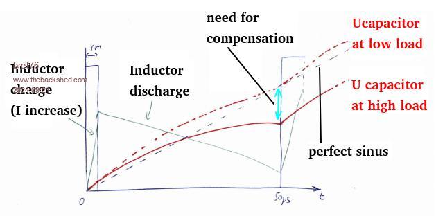 I have the same feeling, although I express it in a way as I can : - I am talking just about the first 50µS of the sinusoid for simplicity. At the beginning, the capacitor is discharged, the inductor discharged. I assume that there is no PWM regulation at the moment. - during "Ton" of the MOFSET, the inductor charges (current in the inductor increases). The inductor always charges with the same energy (because it charges for XXµs). - during "Toff" of the MOFSET, the inductor transmits its energy (current of the inductor decreases) to the capacitor which charges, but also to the load. - the capacitor during the charging stabilizes the voltage and the discharge current of the inductor. - at the end of the 50µs period, the voltage must have "risen" to follow the theoretical sinusoid. Something like sin(n x 2 x PI / 400) x Ubatt - If the load is low, the inductor will discharge only into the capacitor. The PWM is set for this value, everything is ok. But if the load becomes larger, this energy will have to be distributed between the capacitor and the load. The capacitor will therefore receive less energy. So the capacitor voltage will vary according to the importance of the load (so at each step, we will deviate from the theoretical sinuzoid). I have the impression that this is what we see here. Then the controller increases the "Ton" and therefore increases the energy that the inductor will store and everything will be good. - putting a larger capacitor would improve stability, but would imply a smaller inductance which would require more current to charge, therefore more losses. So it seems that there is a trade-off to be made between losses and stability (in electronician words: to choose the resonance frequency ).This is what I'm trying to understand little by little....don't hesitate to tell me if I didn't understand anything. According to the calculations I'm trying to do (L, U, R in parallel), KeepIS seems to have found a very good compromise on its inductance value! And unless I correct the sinusoid every 50µs, I don't see how to do better! I'm adding a diagram for clarity. I feel like I'm not playing in the same league as KeepIS, which will soon be speaking in megawatt ! |