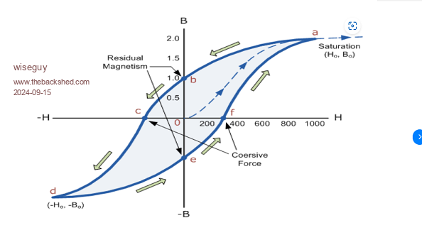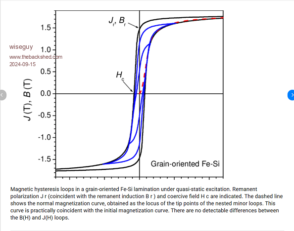Phil, whilst I agree with almost everything you said I am having a problem with the gist of the last few sentences re residual magnetism. In the interests of education (me included) I looked up graphs of BH curves & residual magnetism. I believe the focus was initially related to the heating or lack of it in KeepIS's Toroids First a BH curve that shows soft iron and non silicon steel typical magnetic behaviour. ![]() The curve shows as you stated the residual magnetism when the magnetising force is reduced to zero at the point where the graph crosses the B axis & shows maybe 50% residual magnetism. The excitation was ~ 2 Tesla, the remanence is around half that value. Now a graph showing a typical silicon steel BH curve. ![]() This graph shows saturation at around 1.8 Tesla but the remanence where the B axis is crossed is much higher at around 1.5. I agree, the area within the BH loop is related to losses and heating and compared to the first graph the BH area is much reduced. But there are a couple of other things to mention further, one is that we usually aim for ~ 1 Tesla in our transformers so we are well away from saturation and the BH area is thus reduced accordingly. The second is that from the graphs it appears that we can change the flux in the cores with realtively small energy input due to its permeability. The second silicon core hysteresis diagram shows higher retentivity of the material and it is closer to the saturation point. Little extra additional flux (in the same direction) would put the core into full saturation which from the graph shape is a very hard saturation. In my experience, big Toroids can make a hell of a thump and trip circuit breakers which I think also goes against "little residual magnetism"? This response is not to argue, as I am open to being corrected if I have misinterpreted the graphs etc, I don't care as much about being right or wrong, just keen to better understand the black art of magnetics. "A great deal of work went into minimizing residual magnetism in GOSS as having to reverse the residual every half cycle causes a power loss". Could it be more correct to say that a lot of work went into making GOSS material where the intrinsic magnetic domains were more readily/easily influenced (demagnetised/remagnetised) to counteract the otherwise high residual magnetism each cycle thus reducing power loss? A comment about the 1.5V cell, which could theoretically supply a current of ~ 15A with a 0.1R impedance & with 200Turns, that is equivalent to 3,000 Ampere turns which sounds significant from the 1.5V cell ? The cell should be able to cause saturation I think in either direction ? Your further comments would be appreciated. Edited 2024-09-15 23:38 by wiseguy If at first you dont succeed, I suggest you avoid sky diving.... Cheers Mike |