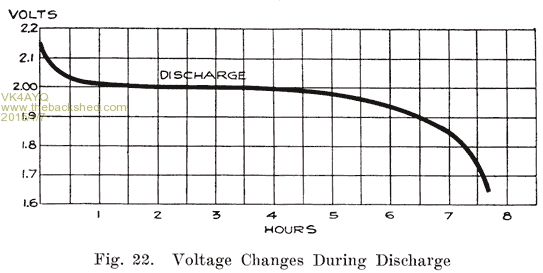 The voltage does not depend upon the area of the plate surface but upon the nature of the active materials and the electrolyte. Hence, although the plates of a cell are gradually being covered with sulphate, the voltage, measured when no current is flowing, will fall slowly and not in proportion to the amount of energy taken out of the cell. It is not until the plates are pretty thoroughly covered with sulphate, thus making it difficult for the acid to reach the active material, that the voltage begins to drop rapidly. This is shown clearly in Fig. 22, which shows that the cell voltage has dropped only a very small amount when the cell is 50% discharged. With current flowing through the cell, however, the increased internal resistance causes a marked drop in the voltage. Open circuit voltage is not useful, therefore to determine how much energy has been taken from the battery.