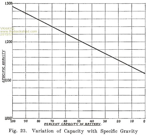 If a battery is allowed to stand idle for a short time after a partial discharge, the specific gravity of the electrolyte will decrease because some, of the acid in the electrolyte will gradually flow into the pores of the plates to replace the acid used up while the battery was discharging. Theoretically the discharge can be continued -until all the acid has been used up, and the electrolyte is composed of pure water. Experience has shown, however, that the discharge of the battery should not be continued after the specific gravity of the electrolyte has fallen to 1.150. As far as the electrolyte is concerned, the discharge may be carried farther with 'safety. The plates determine the point at which the discharge should be stopped. When the specific gravity has dropped from 1.300 to 1.150, so much sulphate has been formed that it fills the pores in the active material on the plates. Fig. 23 shows the change in the density of the acid during discharge.