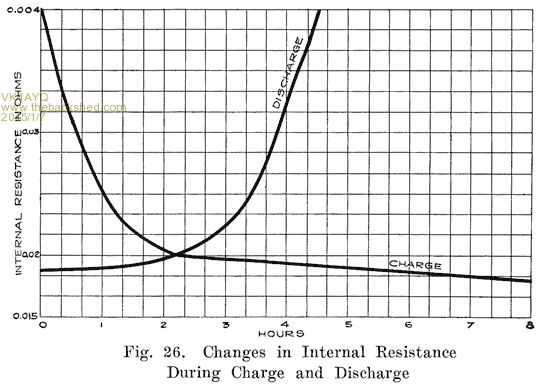 As long as a discharge current is flowing from the battery, the acid within the plates is used up and becomes very much diluted. Diffusion between the surrounding electrolyte and the acid in the plates keeps up the supply needed in the plates in order to, carry on the chemical changes. When the discharge is first begun, the diffusion of acid into the plates takes place rapidly because there is little sulphate clogging the pores in the active material, and because there is a greater difference between the concentration of acid in the electrolyte and in the plates than will exist as the discharge progresses. As the sulphate begins to form and fill up the pores of the plates, and as more and more acid is abstracted from the electrolyte, diffusion takes place more slowly.