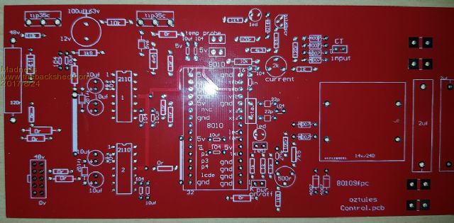 I don't know what happened to my control board when I finished it on the cap end... I did not check the board dimension I think.... makes no difference, but would have looked better with a few mm more perhaps. Looking good.... as expected..... just wondering of your red ones will run speedier than the blue ones .........oztules Village idiot...or... just another hack out of his depth |