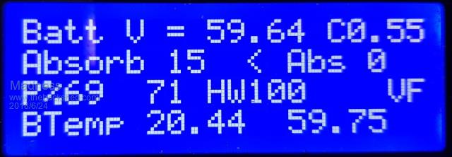 Hi Neil, The numbers are all set for Flooded Lead Acid, my battery is a 48V 775AH FLA forklift battery. So you will be able to run the code as is except you may need to change the address for your LCD display. But you do need all the libraries installed, downloading and installing the file above should take care of that for you. These are the only parts you should need to do anything with. // Start the LCD display library LiquidCrystal_I2C lcd(0x27, 2, 1, 0, 4, 5, 6, 7, 3, POSITIVE); // Set the LCD I2C address 0x3F or 0x27 //===========================MAIN CHARGER SETTINGS, REFER TO YOUR BATTERY MANUAL================================================================== float batv = 48; // nominal battery voltage 24 OR 48, could work with 12V with 18v power supply for FET driver chips on pcb double floatVolts = 54.0; // User setting for the FLOAT voltag double absorbCharge = 59.2; // User setting for the ABSORPTION voltage long timedOut = 200; // ABSORPTION MINUTES int startAllOverAgain = 51.5; // User setting for resetting the charge cycle, usually overnight or after heavy drawdown int startOverTime = 5; //?? Minutes below Start over voltage to take effect int Ventfanvolts = 51.0; // Turn on battery vent fan There are only 10 types of people in the world: those who understand binary, and those who don't. |