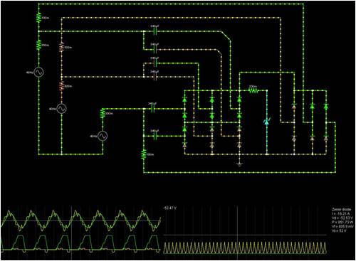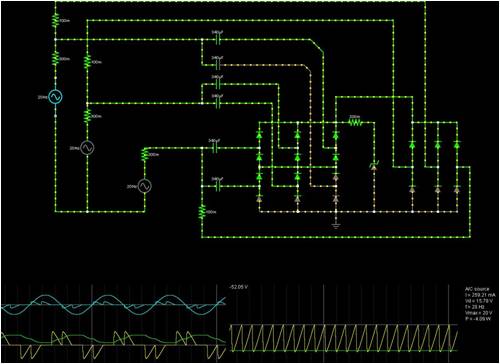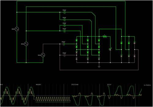 Some good news for readers. Sparweb has found a neat program simulator that can show us non engineers visually the goings on with the cap voltage multiplier. Here is a link to the program. link. Here is the code needed to be imported that shows a typical cap doubler with normal rectifiers. $ 1 5.0E-6 9.384708165144016 39 15.0 45 v 272 256 272 352 0 1 30.0 30.0 0.0 0.0 0.5 c 640 160 720 160 2 9.92E-4 -17.67901631491416 c 640 224 720 224 2 9.92E-4 -0.351918984121968 c 640 272 720 272 2 9.92E-4 0.3734551172509484 c 640 320 720 320 2 9.92E-4 39.17435240512117 w 640 272 640 320 0 w 640 160 640 224 0 w 272 256 272 160 0 w 272 160 640 160 0 d 976 592 976 528 1 0.6 d 976 480 976 432 1 0.6 d 976 432 976 368 1 0.6 d 880 592 880 528 1 0.6 d 880 480 880 432 1 0.6 d 880 432 880 368 1 0.6 d 784 592 784 528 1 0.6 d 784 480 784 432 1 0.6 d 784 432 784 368 1 0.6 w 784 592 880 592 0 w 880 592 976 592 0 w 784 368 880 368 0 w 880 368 976 368 0 w 720 320 816 320 0 w 816 320 816 528 0 w 816 528 880 528 0 w 720 272 832 272 0 w 832 272 832 432 0 w 832 432 880 432 0 w 720 224 896 224 0 w 896 224 912 240 0 w 912 240 912 528 0 w 912 528 976 528 0 w 720 160 912 160 0 w 912 160 944 192 0 w 944 192 944 432 0 w 944 432 976 432 0 g 976 592 976 624 0 r 976 368 1072 368 0 1.0 z 1072 592 1072 368 1 0.805904783 44.0 w 976 592 1072 592 0 w 272 352 272 592 0 v 352 384 352 480 0 1 30.0 30.0 0.0 2.0943951023931953 0.5 v 496 464 496 592 0 1 30.0 30.0 0.0 4.1887902047863905 0.5 w 352 480 352 592 0 w 352 384 352 320 0 w 352 320 640 320 0 w 496 592 352 592 0 w 352 592 272 592 0 d 784 528 784 480 1 0.805904783 d 880 528 880 480 1 0.805904783 d 976 528 976 480 1 0.805904783 w 976 480 880 480 0 w 880 480 784 480 0 c 720 528 640 528 2 0.0010 0.3609152093302752 w 784 528 720 528 0 c 704 432 640 432 2 0.0010 23.06587609907122 w 784 432 704 432 0 w 640 528 640 432 0 w 640 432 496 432 0 w 496 432 496 464 0 d 1168 592 1168 480 1 0.805904783 d 1168 480 1168 368 1 0.805904783 d 1232 592 1232 480 1 0.805904783 d 1232 480 1232 368 1 0.805904783 d 1280 592 1280 480 1 0.805904783 d 1280 480 1280 368 1 0.805904783 w 1280 368 1232 368 0 w 1232 368 1168 368 0 w 1168 368 1168 304 0 w 1168 304 976 304 0 w 976 304 976 368 0 w 1280 592 1232 592 0 w 1232 592 1168 592 0 w 1168 592 1072 592 0 w 640 528 640 656 0 w 640 656 1312 656 0 w 1312 656 1312 480 0 w 1312 480 1280 480 0 w 352 320 352 112 0 w 352 112 1120 112 0 w 1120 112 1120 480 0 w 1120 480 1168 480 0 w 272 160 272 64 0 w 272 64 1200 64 0 w 1200 64 1200 480 0 w 1200 480 1232 480 0 o 0 64 0 35 40.0 102.4 0 -1 o 38 64 0 35 80.0 51.2 1 -1 This App is an interactive unit, and frequency and voltages and capacitor sizing can be altered, etc. Multiple components can be graphed to show related interactions. Well done Stephen, finding this. I think we are free to download and use it. Here is a pic of typical display. App is good on a large, high res monitor.